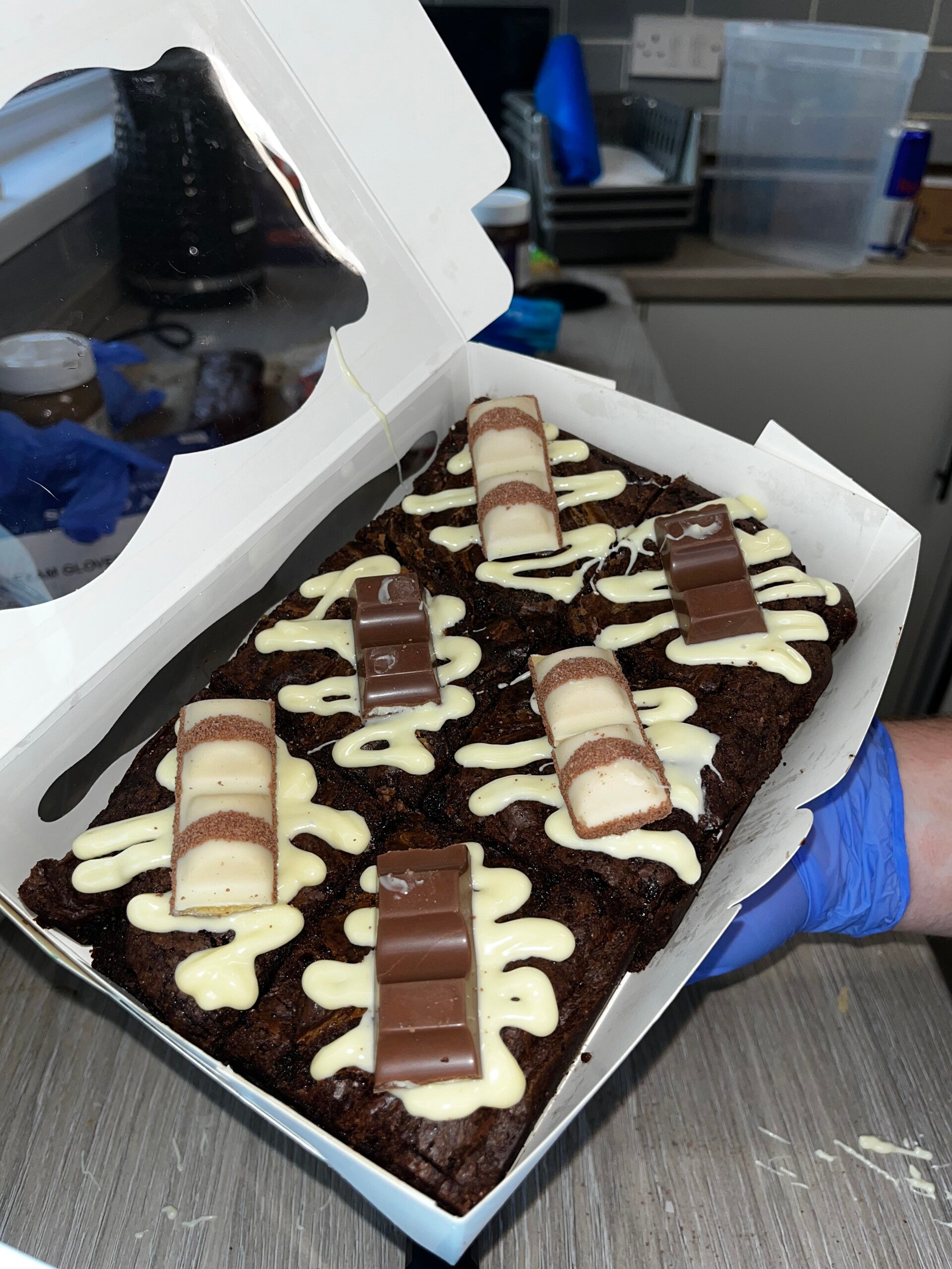 Chocolatey gooey fudgey goodness packed with kinder swearls and topped with bueno and kinder bars perfect to share, as a gift or to just pig out