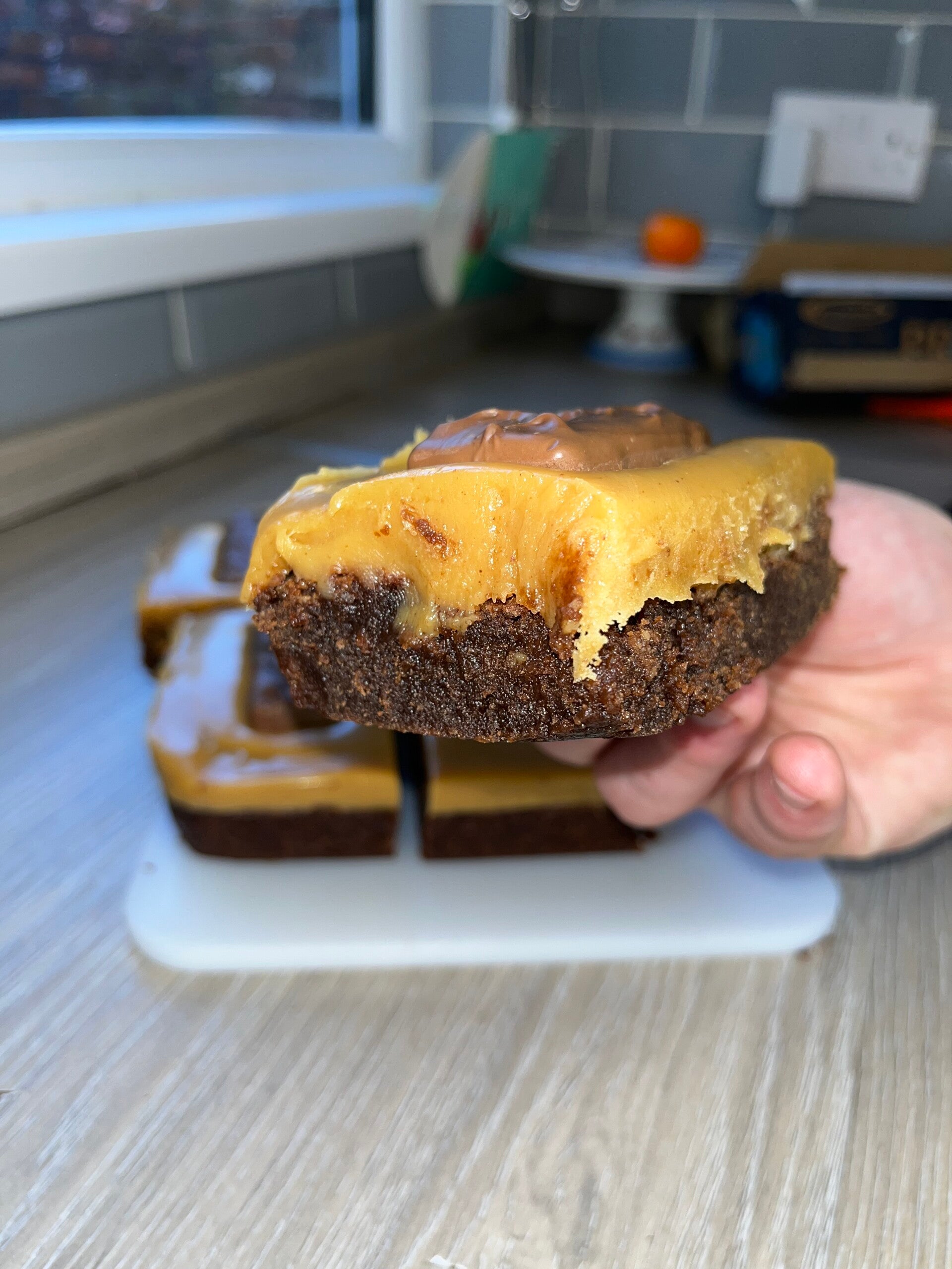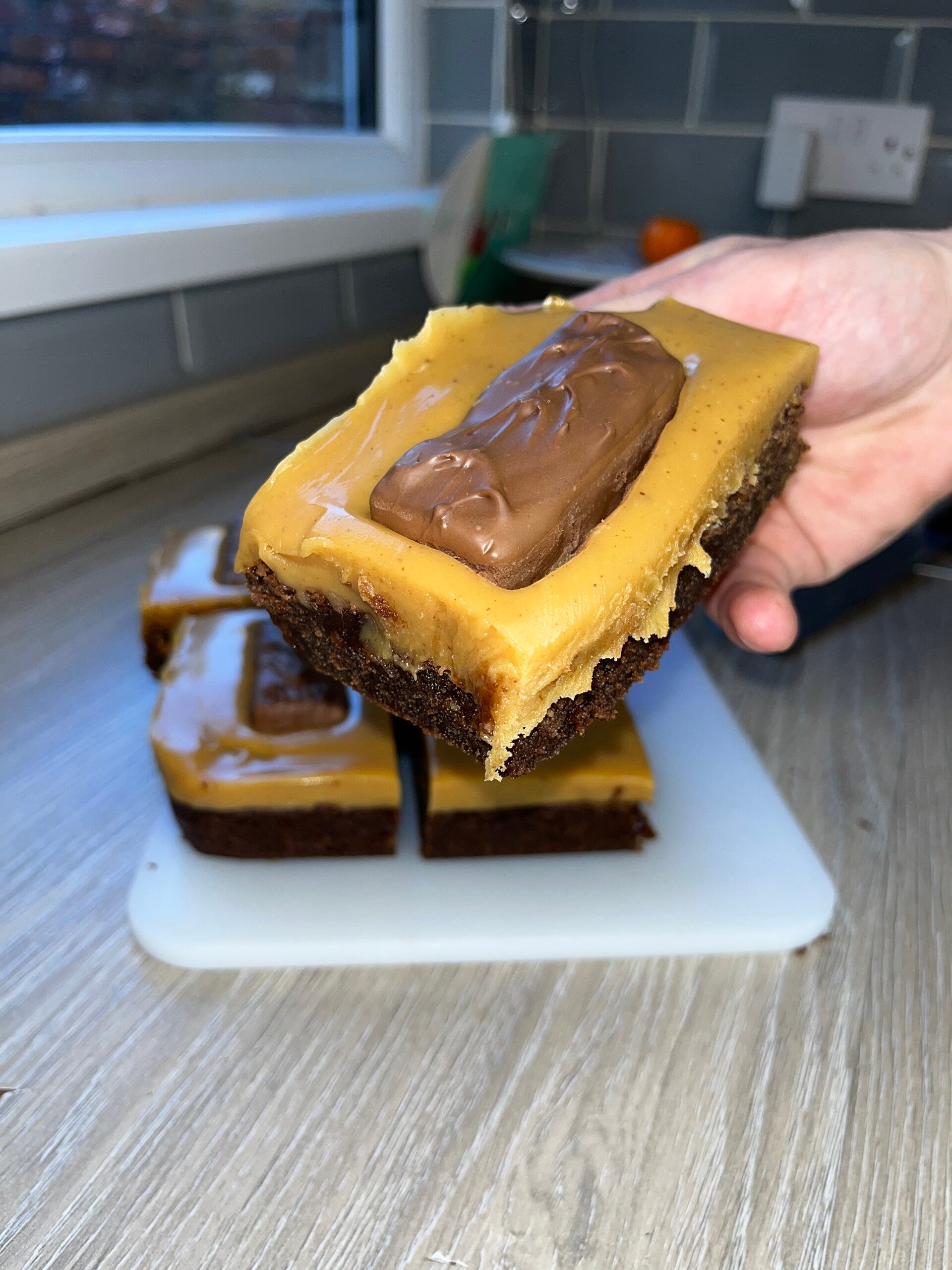 Our gorgeous chocolate brownies topped with a layer of caramel and topped with a snickers bar😮💨
